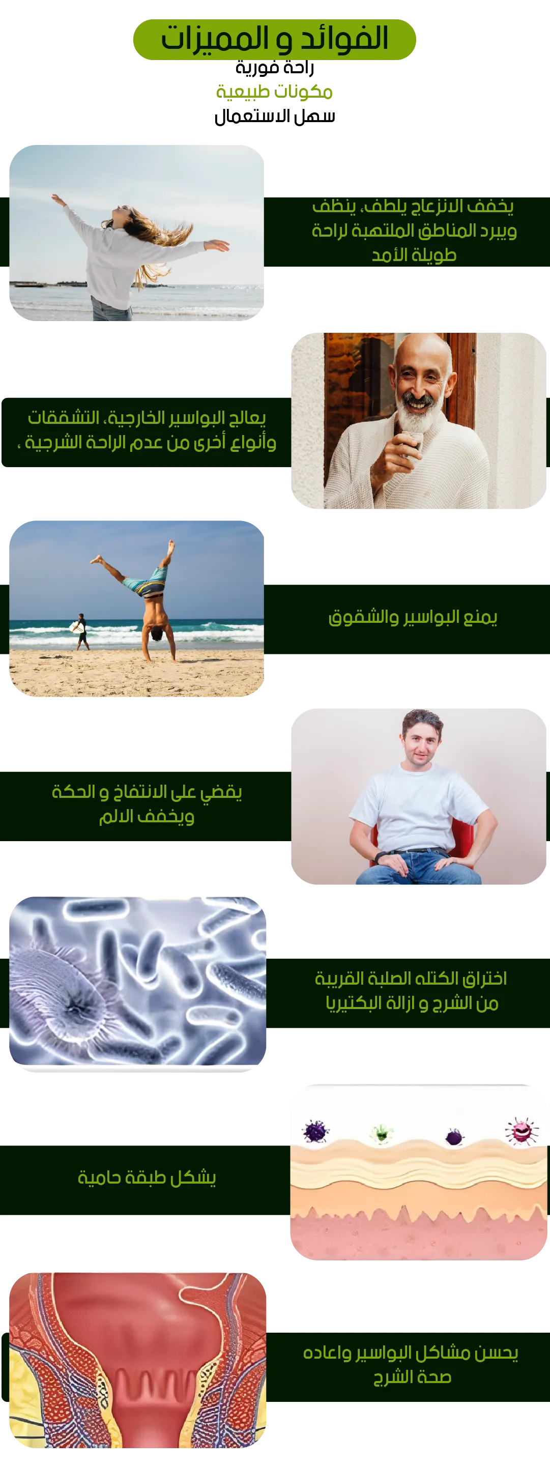 * يوفر بخاخ البواسير الخاص بنا راحة سريعة من الانزعاج والحكة والحروق المرتبطة بالبواسير، وذلك بفضل مزيجه الفريد من المكونات الطبيعية.