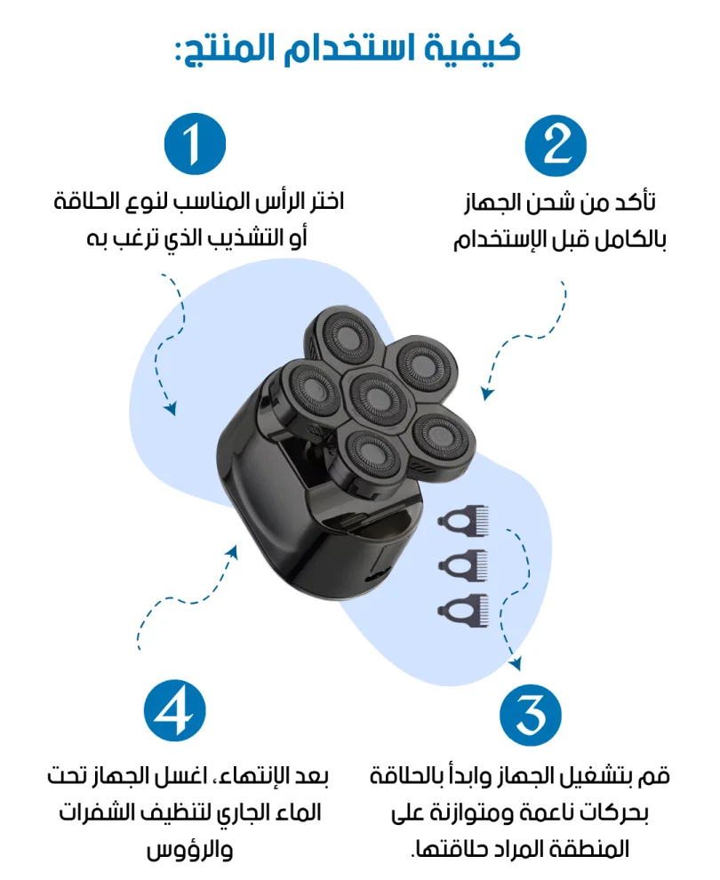 تأتي هذه الماكينة مع ستة رؤوس تجعلها متعددة الوظائف وتتيح لها إمكانية إزالة الشعر في أي مكان، كما أن طريقة صناعتها جعلتها تتكيف مع ملامح وجهك ورقبتك وذقنك، مما يضمن لك حلاقة مريحة ودقيقة