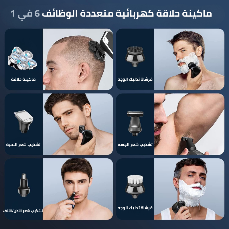 تأتي ماكينة حلاقة الشعر 6 في 1 مع ملحقات قابلة للفصل، بما في ذلك ماكينة حلاقة دوارة، ماكينة قص الشعر، ماكينة تشذيب شعر الأنف، فرشاة تنظيف الوجه، ماكينة تشذيب الجسم، وفرشاة التدليك. مع رؤوس مميزة قابلة للتحويل بحرية.